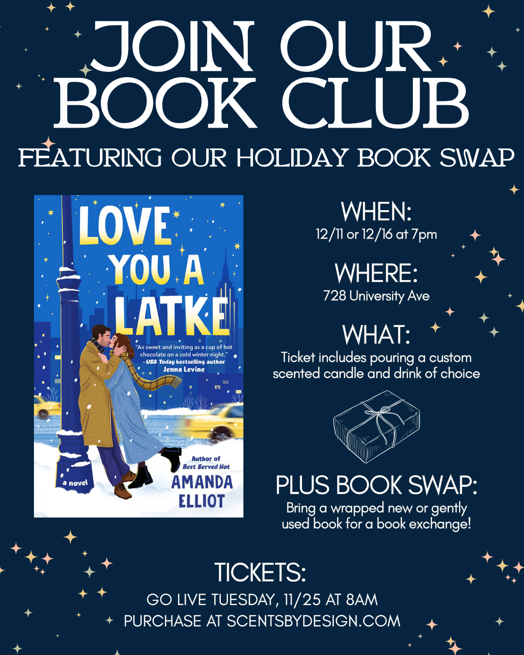 Join us on Thursday 12/11 or Tuesday, 12/16 at 7pm for our book club! Ticket price includes pouring a custom scented candle, one beverage of your choice, and discussion around the book. This month, we'll be reading Love You a Latke by Amanda Elliot. Anyone is welcome to join. Just read the book before our meeting (or not, no judgement, life happens) and come ready to talk about it!