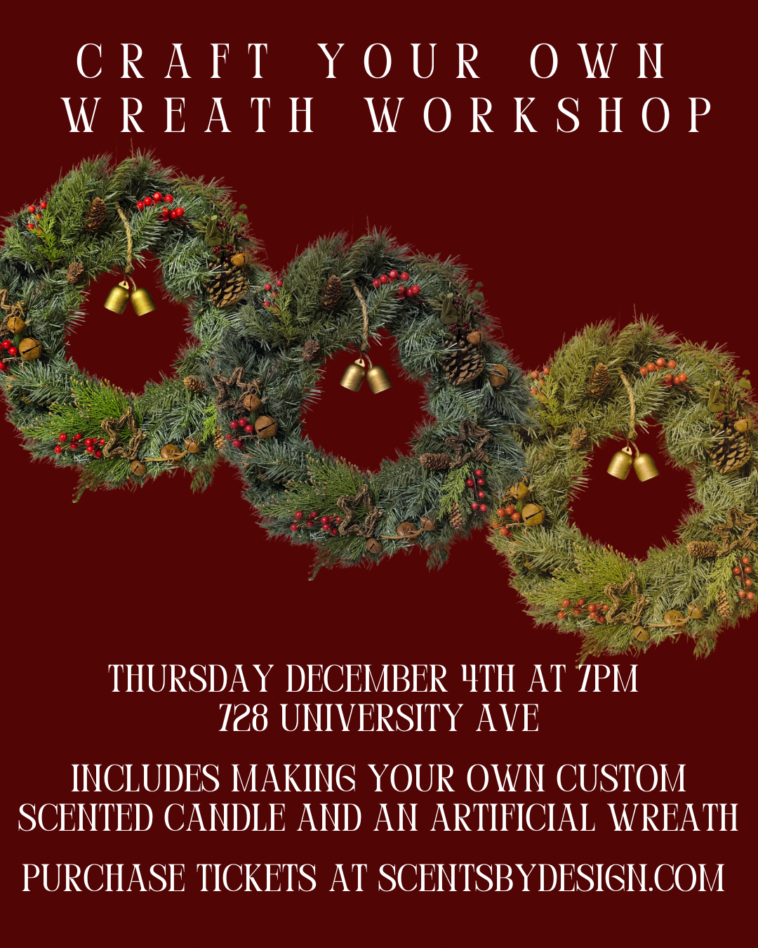 Join us on Thursday, 12/4 at 7pm to make your own wreath! We'll start with pouring custom scented candles (8oz tumbler included in ticket price). Then Shannon will lead us in crafting an artificial wreath! Choose from a variety of styles, including natural, glam, traditional, and more. Whether you prefer a rustic look or a touch of sparkle, there's a design for everyone.